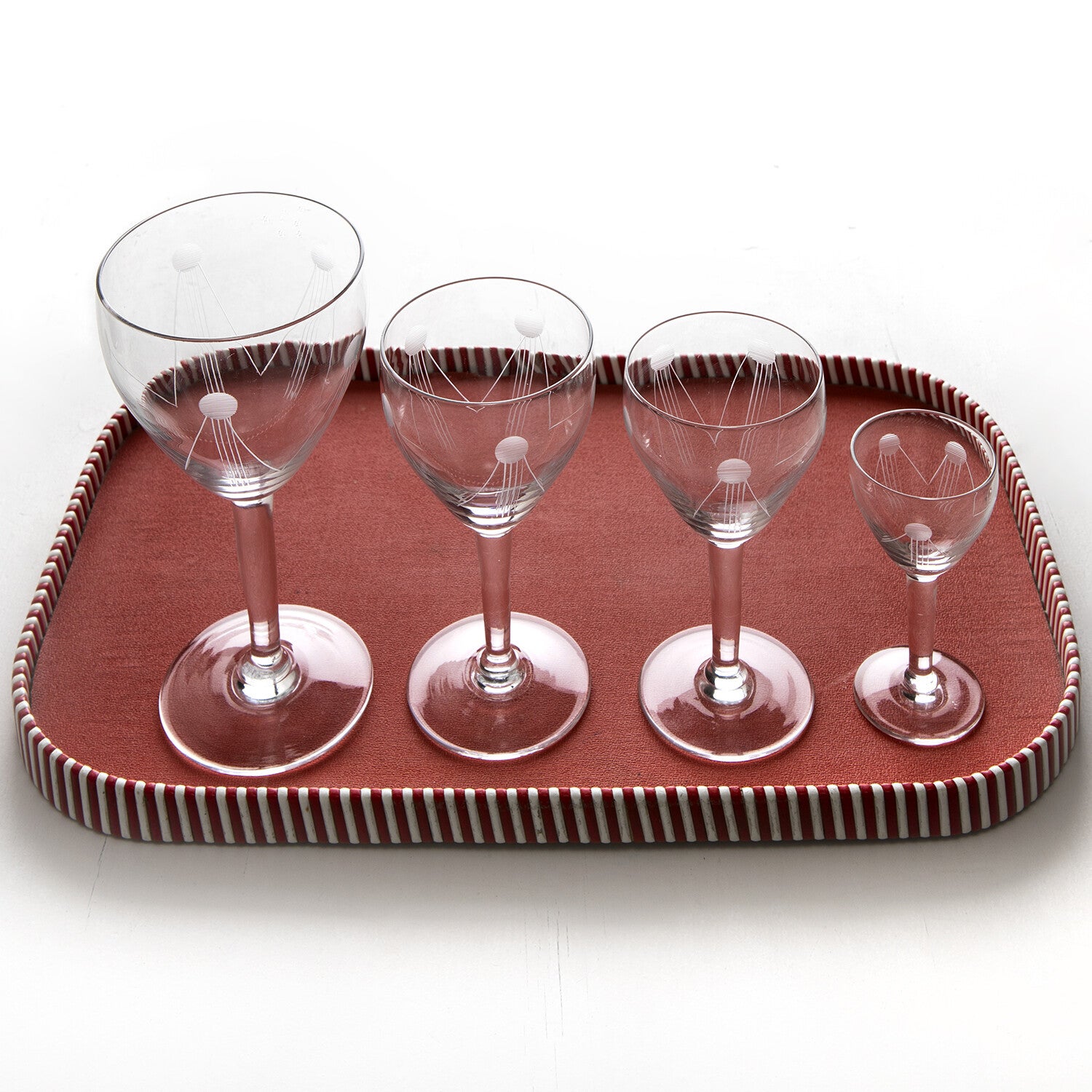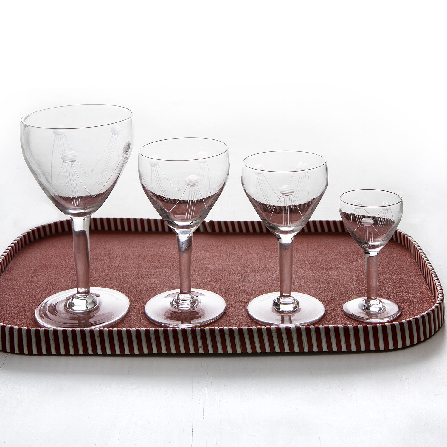 wijglas L, met een ingeslepen dessin. set van 3 stuks.hoogte: 14 cmIn hetzelfde model zijn er glazen XL, S en XS.Alle glazen zijn vintage, maar verkeren in een uitstekende staat.