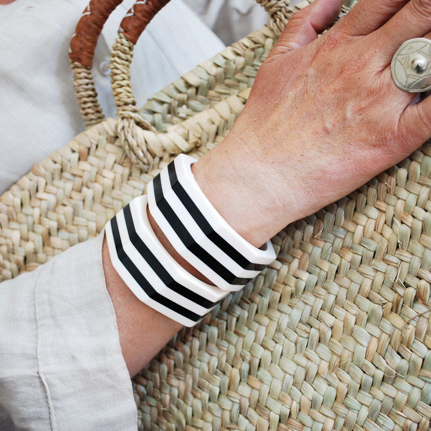 Zomerse armband van resin (kunsthars) in zwart/witte streepjes. De buitenkant is 8-hoekig, die om en om schuin uitlopen. Leuk grafisch accent bij een neutrale look.