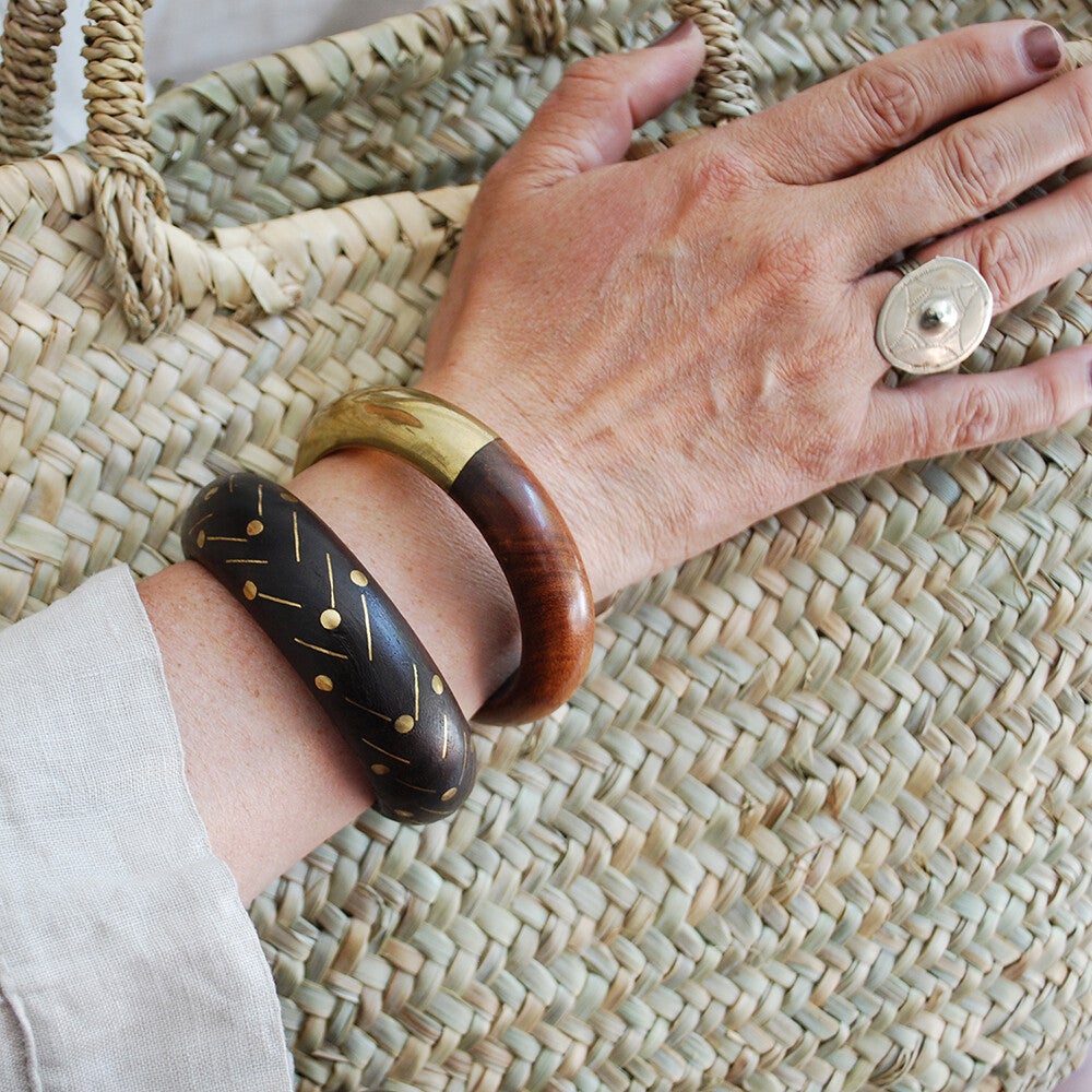 Armband van hout & messing. De helft van de armband is ingelegd met stukjes messing.